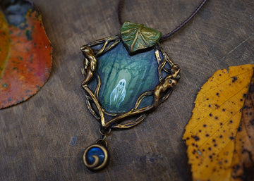 A polymer clay necklace that features a painting of a ghost in the forest done in acrylic paint. There is a labradorite hanging from the bottom.