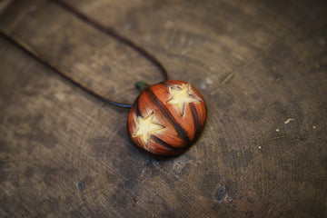 A polymer clay necklace that features a jack-o-lantern with star eyes.