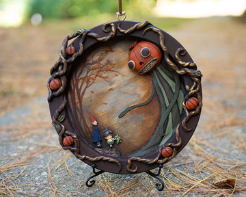 A hand-sculpted polymer clay plaque with Enoch, Greg, and Wirt from Over the Garden Wall. Comes with a screw hook and a cord to hang on a wall. Does not come with the stand pictured.