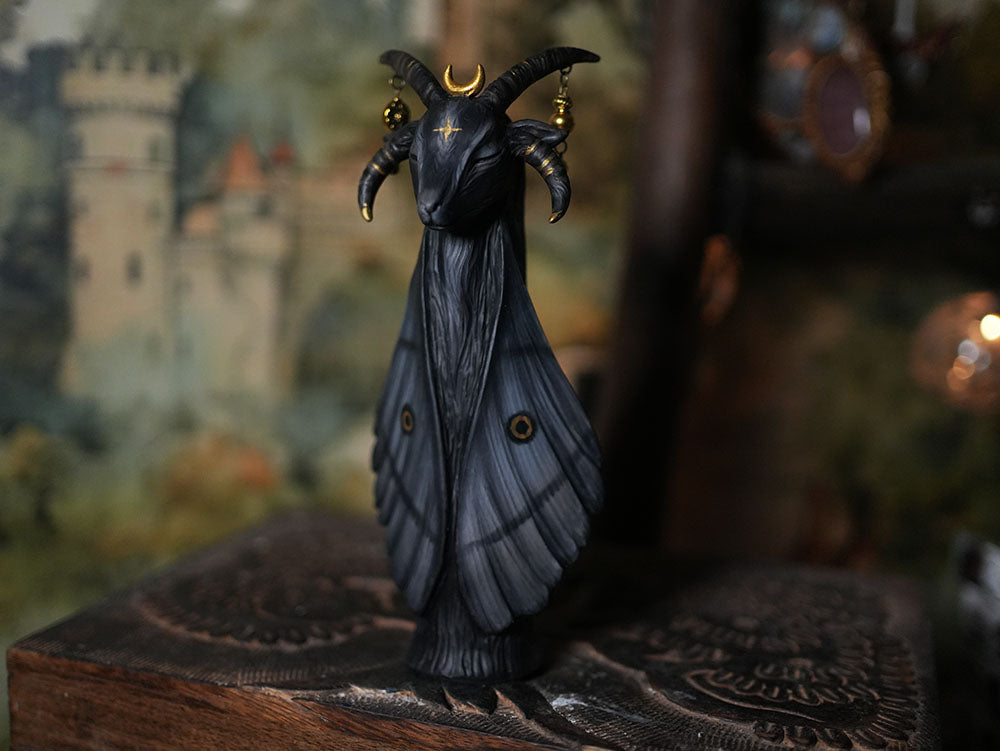 A hand-sculpted polymer clay sculpture that features a black goat with moth wings.