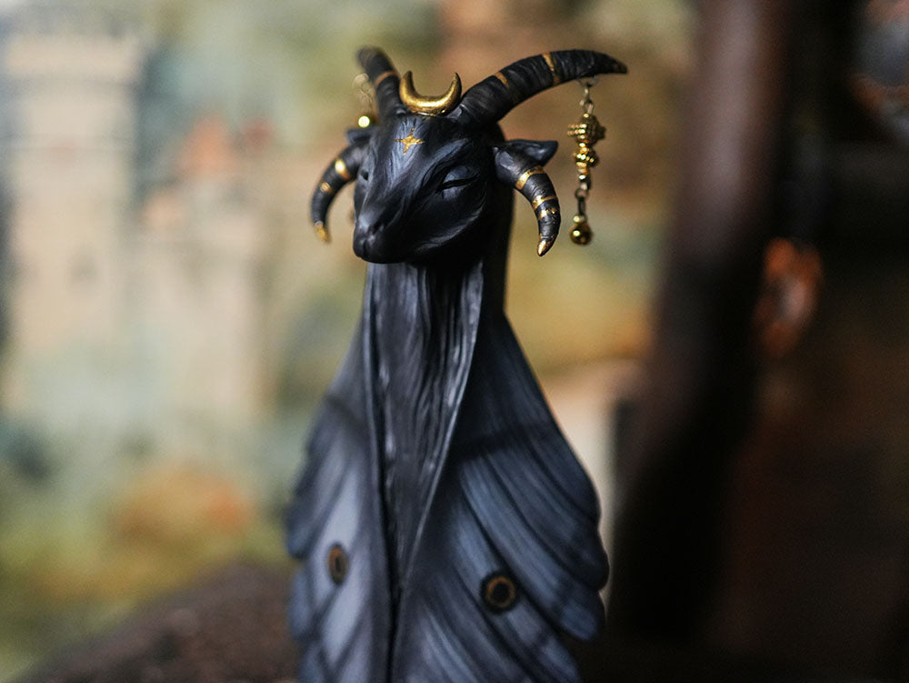 A hand-sculpted polymer clay sculpture that features a black goat with moth wings.