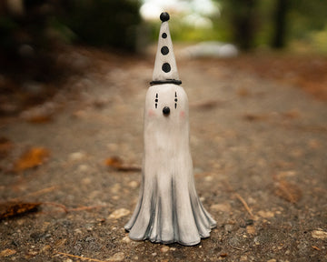 A hand-sculpted polymer clay sculpture that features a little ghost with clown makeup and a hat.