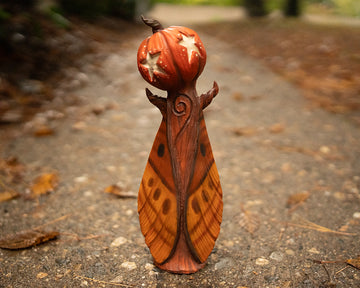 A hand-sculpted polymer clay sculpture that features a jack-o-lantern headed fae creature with death's head moth wings.
