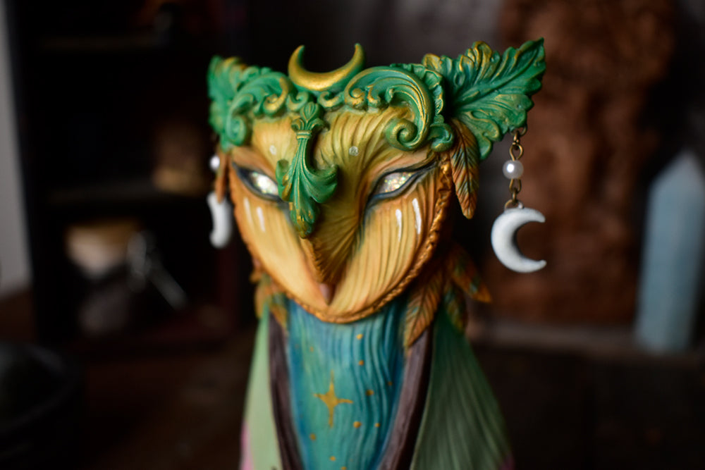 A hand-sculpted polymer clay sculpture that features a barn owl with Chinese moon moth wings.