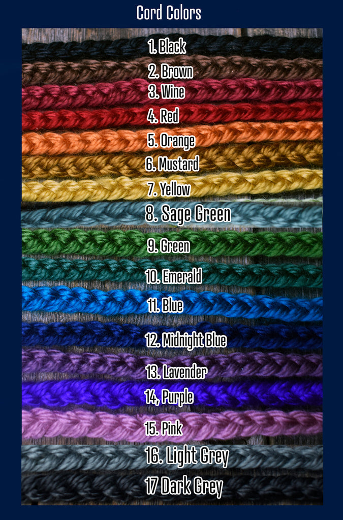 This piece will come on a braided acrylic yarn cord that you tie on. You can choose up to 3 colors for your cord from the drop-down lists. You can see a color chart in the photos of this listing. If you only want one color, you only have to choose a color on the 1st list. Please allow up to 3-5 days for me to get your cord done and your order packaged.