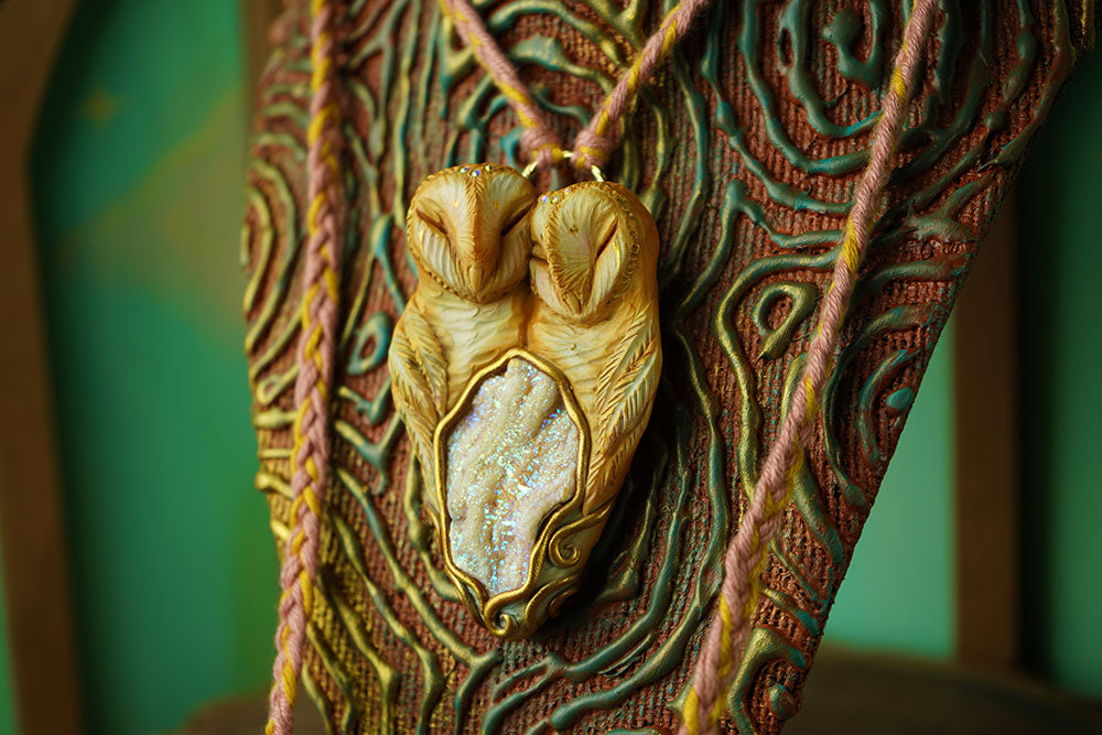 A polymer clay necklace featuring 2 barn owls with an aura chalcedony.