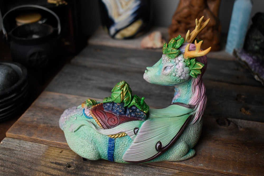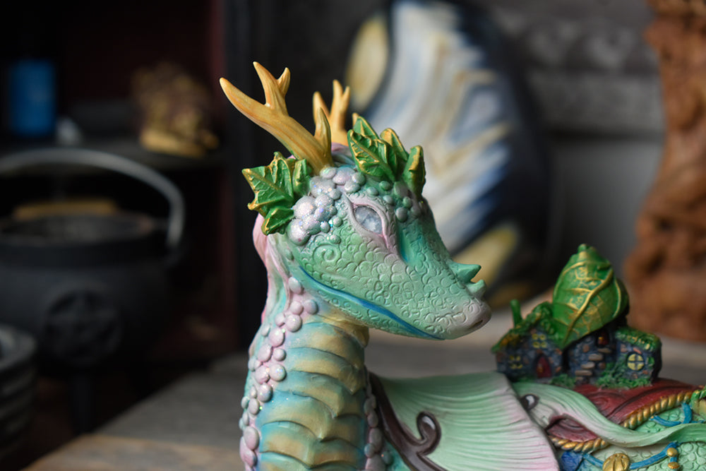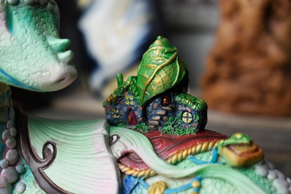 A hand-sculpted polymer clay sculpture that features a dragon with luna moth wings wearing a saddle that carries a small faerie village.