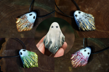 Pendant measures approx. 2" long and comes on a black cord with a sliding knot.
