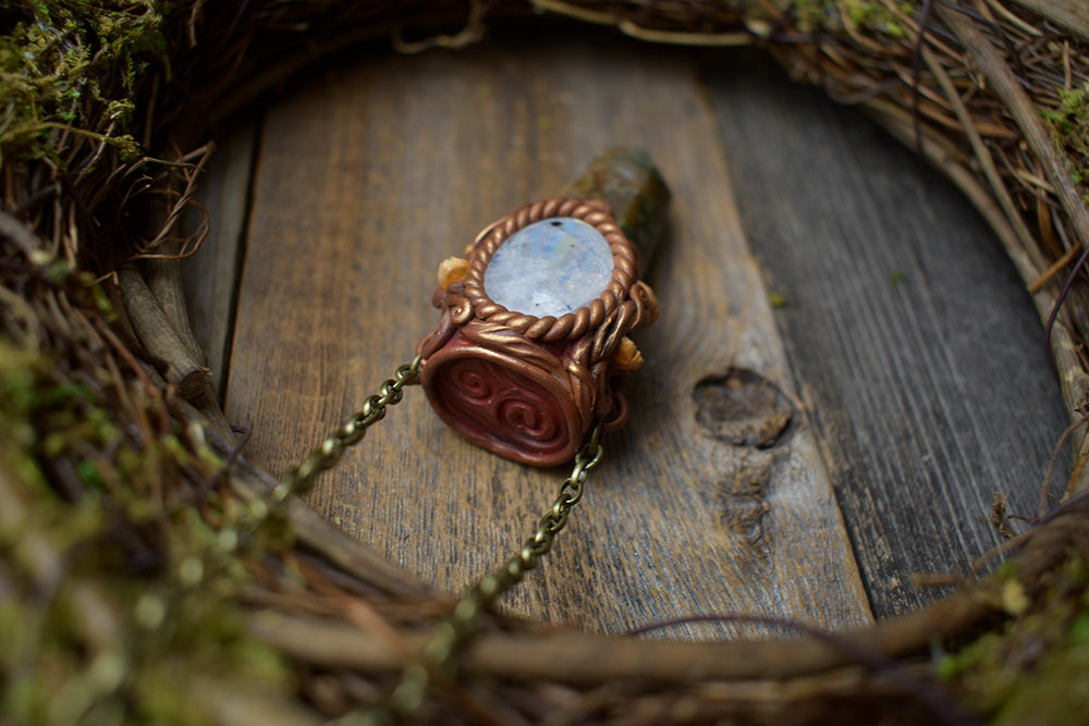 A hand-sculpted polymer clay necklace that features a moss agate point with a rainbow moonstone.