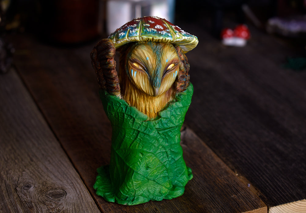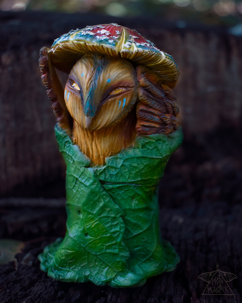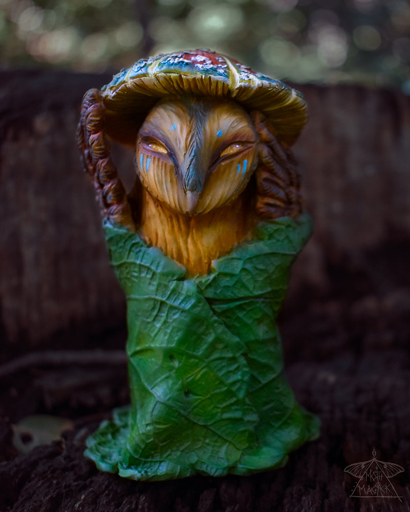 A hand-sculpted polymer clay sculpture that features a barn owl getting cozy wrapped up in a leaf wearing a mushroom hat.