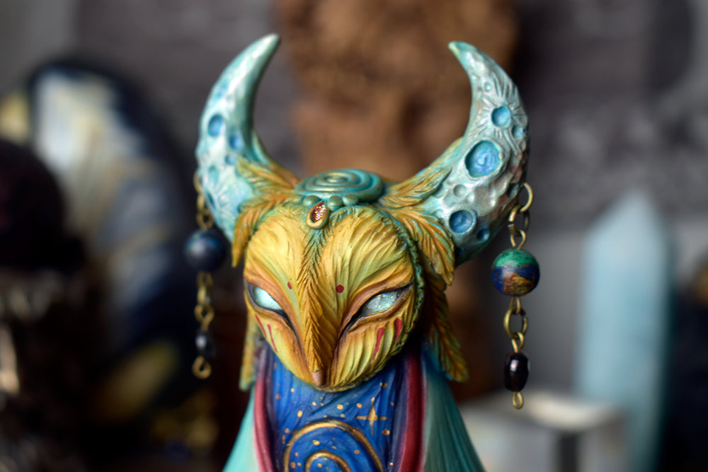 A hand-sculpted polymer clay sculpture that features a barn owl face with luna moth wings and a moon headpiece with an azurite and a garnet bead hanging from each side.