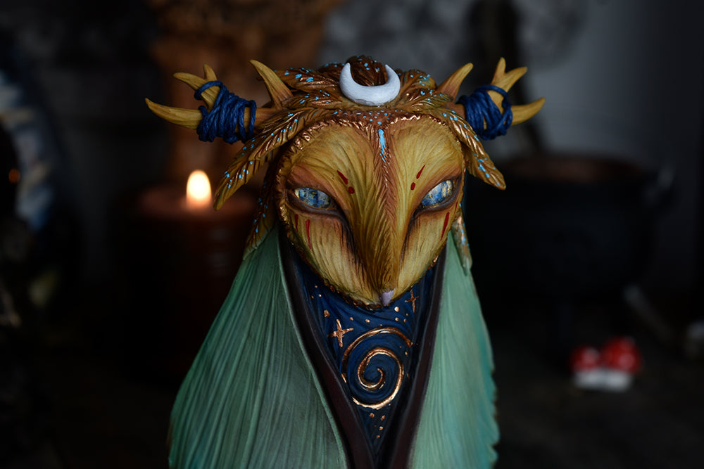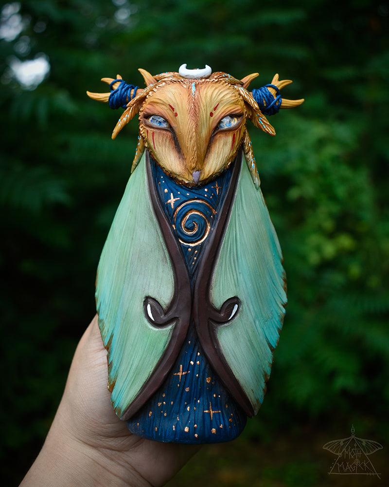 A hand-sculpted polymer clay sculpture that features a barn owl with luna moth wings and antlers. The antlers are wrapped with blue hemp cord. The feathers on the owl are slightly flexible so do not be alarmed if they wiggle a little.