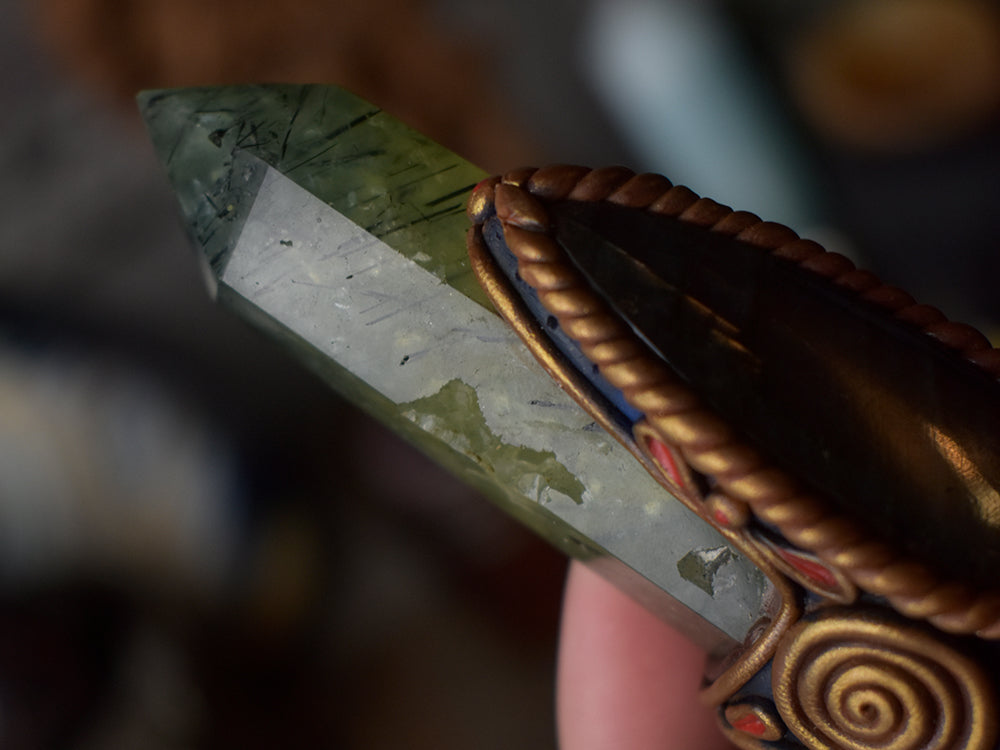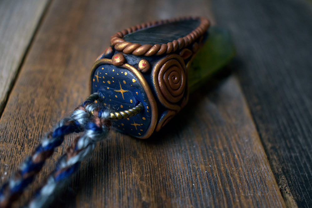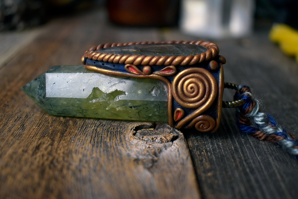 A hand-sculpted polymer clay necklace that features a prehnite point with labradorite.