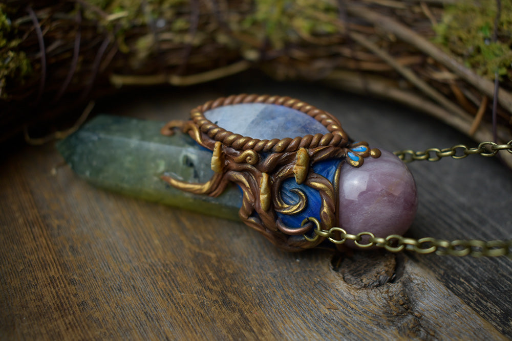 Prehnite Point with Moonstone and Rose Amethyst Necklace - 36" chain