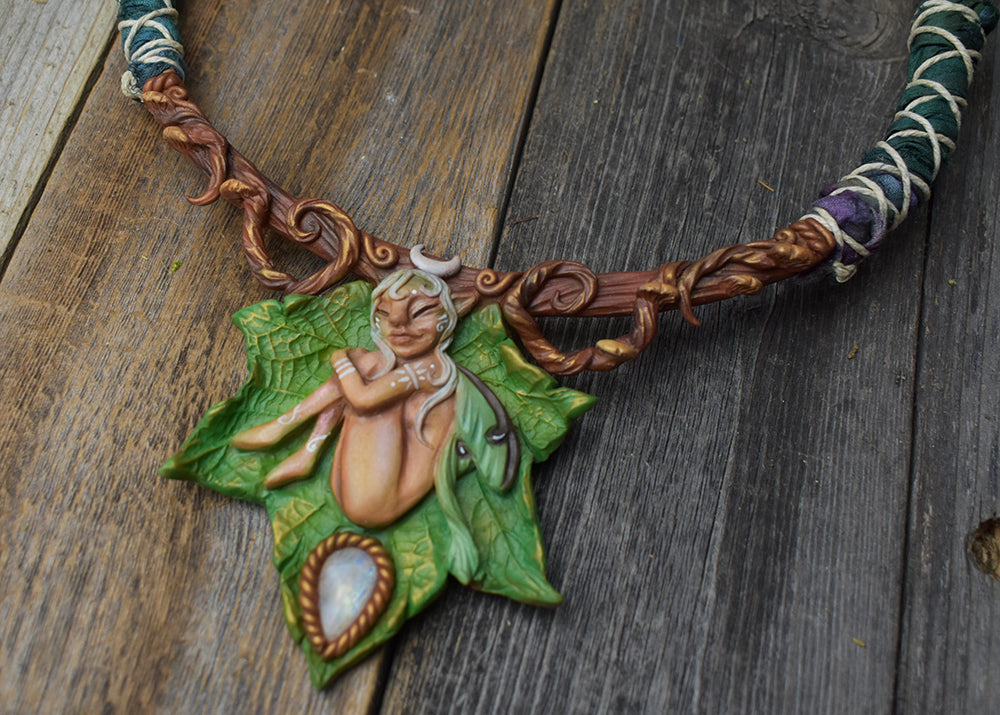 A hand-sculpted polymer clay collar necklace that features a faerie face with luna moth wings, sleeping on a leaf. There is a small moonstone at the bottom of the leaf. The sides of the collar have recycled sari silk and hemp wrappings.