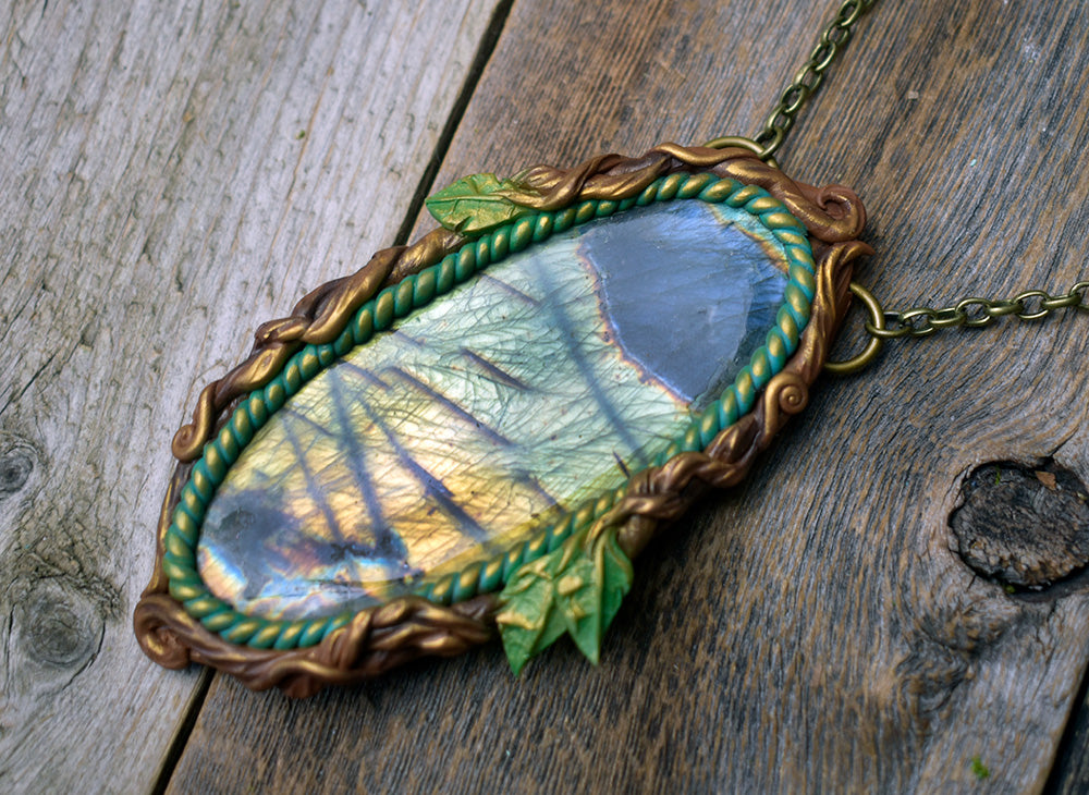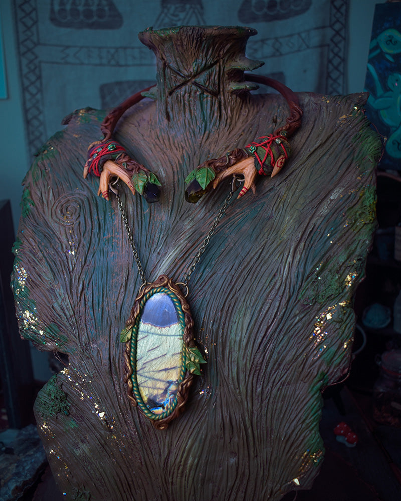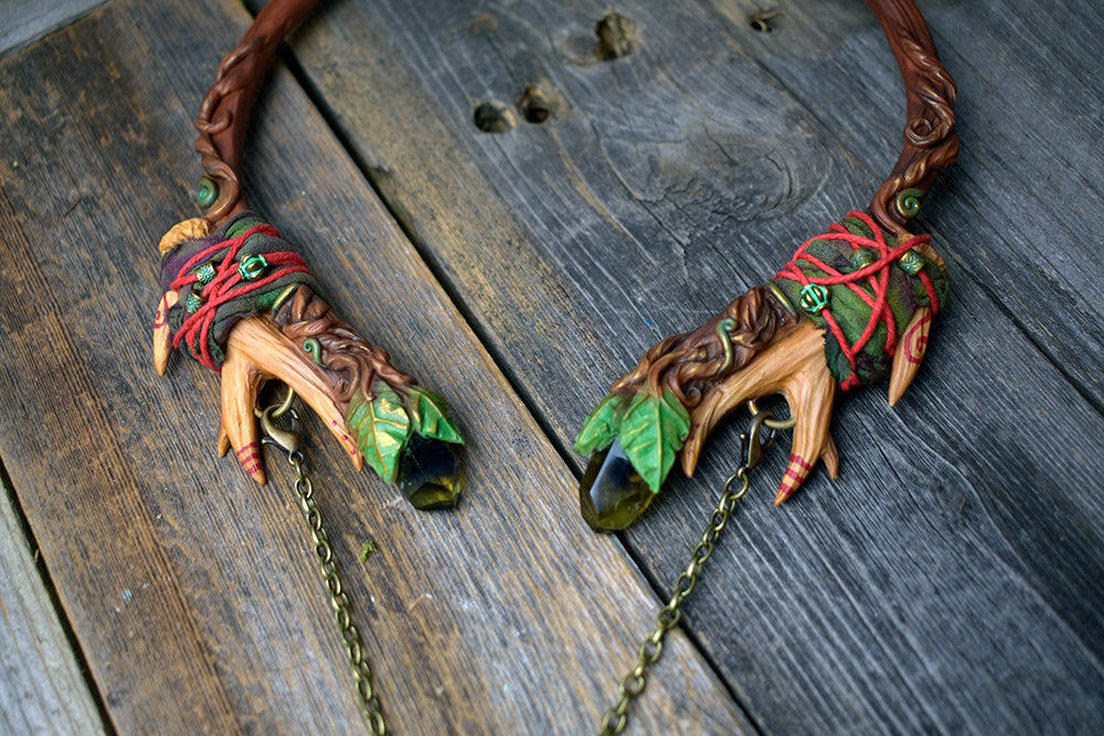 A hand-sculpted polymer clay torc necklace that features two beautiful smoky citrine points on each side and a labradorite hanging from it. There are recycled sari silk and hemp wrappings around the antlers, decorated with small brass beads.