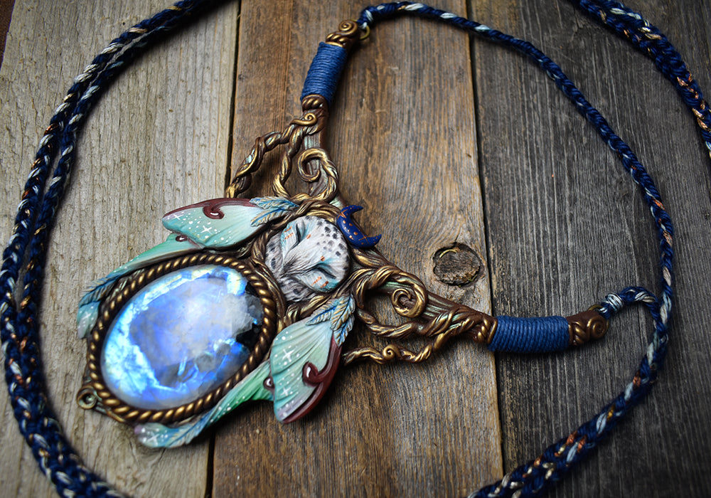 A hand-sculpted polymer clay collar necklace that features a snowy owl with luna moth wings and a big beautiful moonstone. There are also hemp wrappings on the sides.
