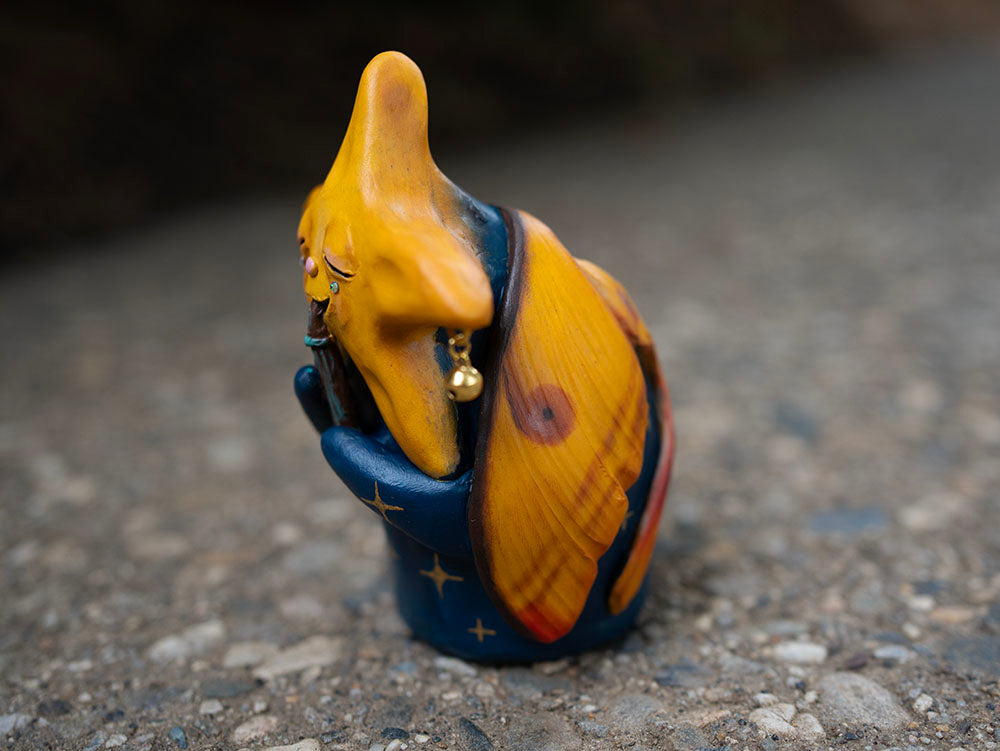 A hand-sculpted polymer clay wall hanging sculpture that has a fella with a star face and moth wings playing a flute. It is 4.5" tall.