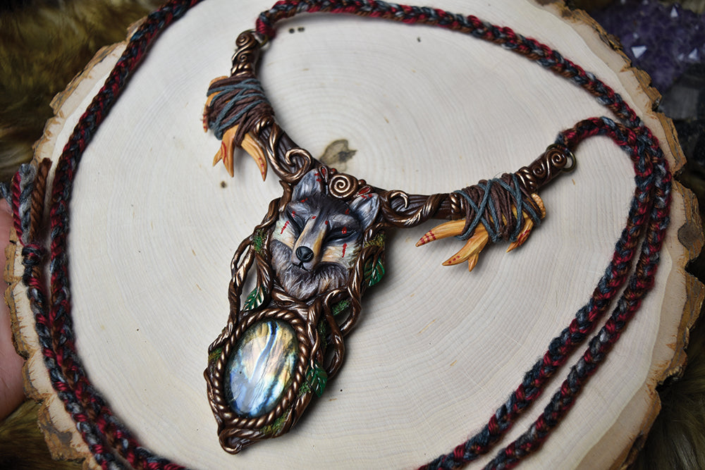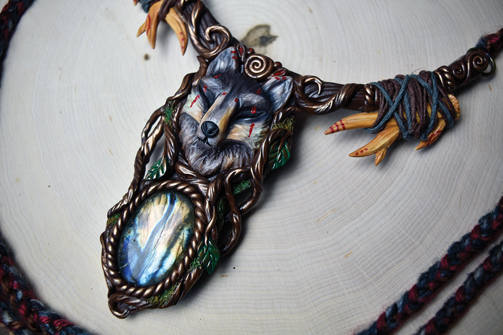 A hand-sculpted polymer clay necklace that features a wolf with a beautiful labradorite and clay antlers with hemp wrappings.