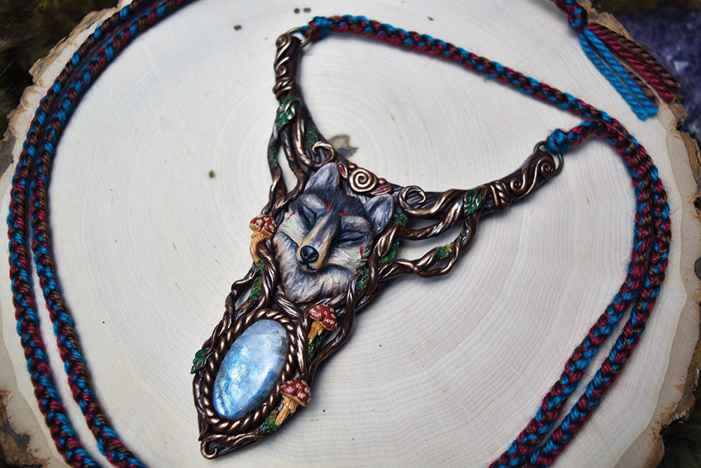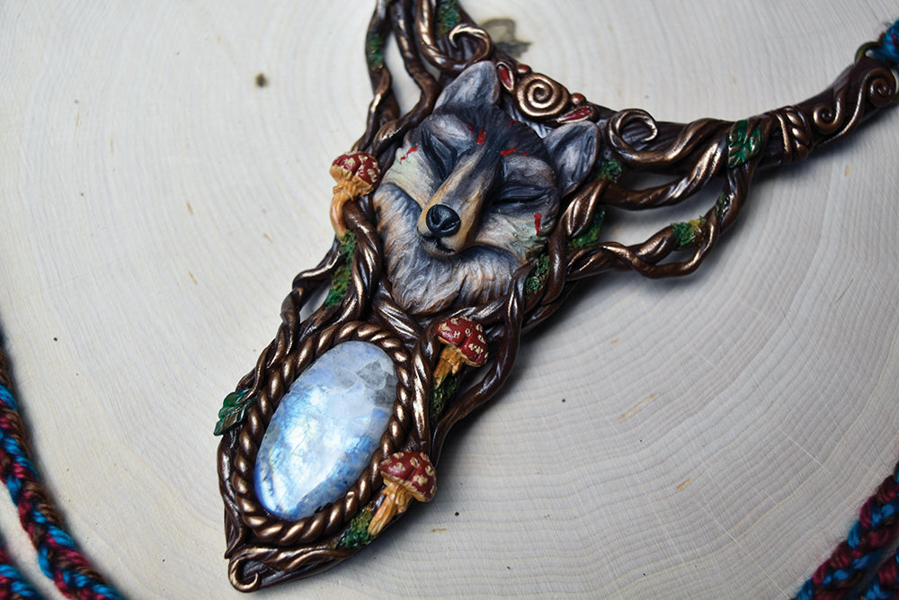 A hand-sculpted polymer clay necklace that features a wolf with a beautiful moonstone.
