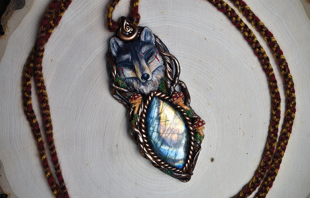 A hand-sculpted polymer clay necklace that features a wolf with a beautiful labradorite.